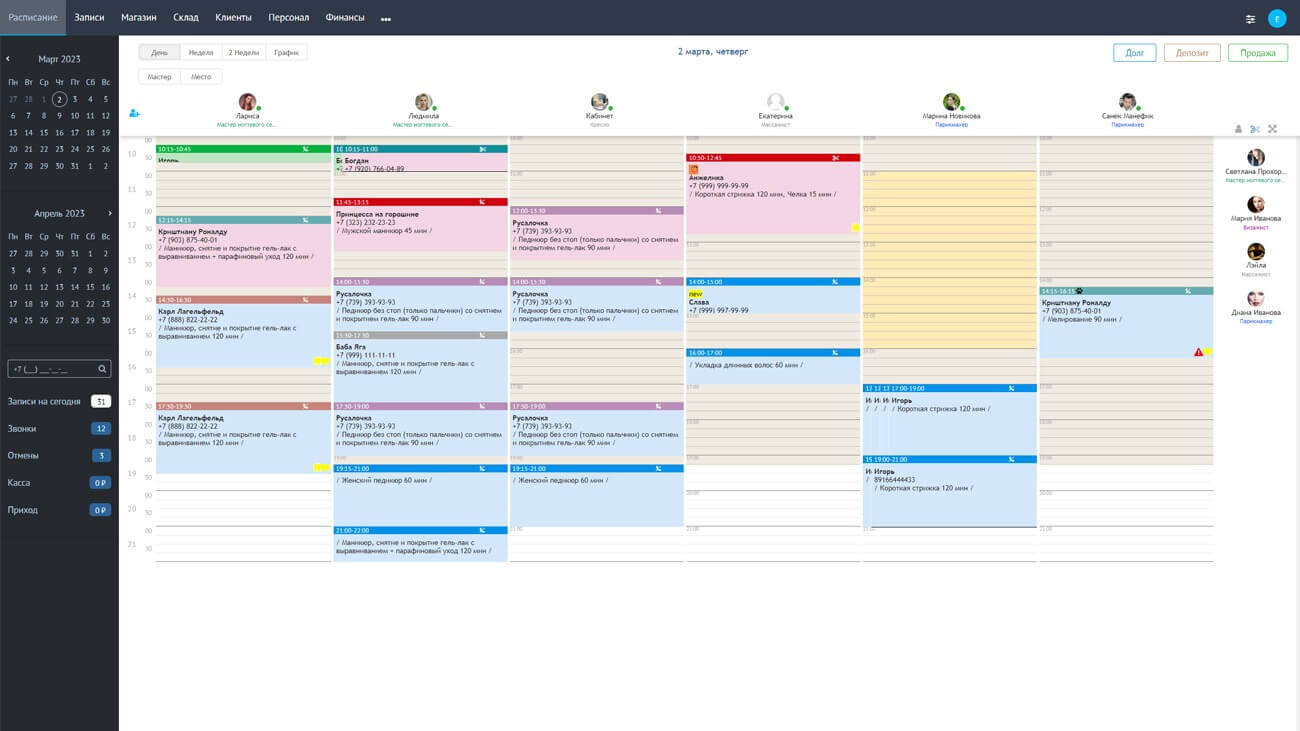 - Онлайн запись: клиенты могут записаться на прием через сайт или приложение в любое время, а сотрудники салона могут управлять расписанием в режиме реального времени.