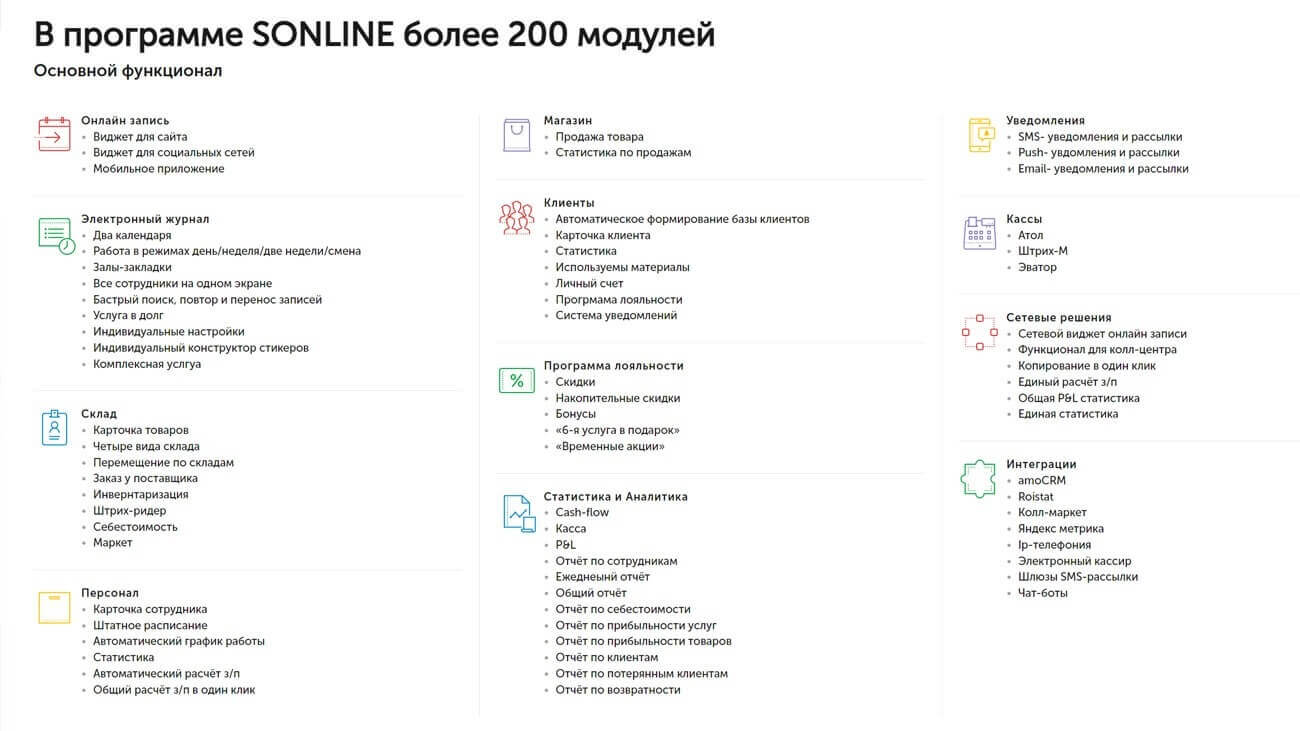 SONLINE может быть полезен для салонов красоты всех типов и масштабов, включая барбершопы, ногтевые студии, студии депиляции или наращивания ресниц и сети салонов. С помощью этой программы можно значительно сократить время, затрачиваемое на рутинные задачи, такие как запись на прием, управление товарным запасом и персоналом, что позволяет сосредоточиться на развитии бизнеса и улучшении качества обслуживания клиентов.