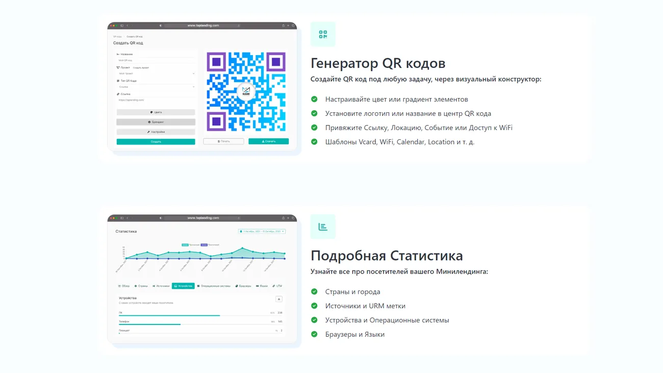 Tap Landing предоставляет информацию о стране и городе, из которого зашел посетитель на сайт, источниках и UTM метках, устройстве и операционной системе. Для получения статистической информации по скачиваниям можно загружать различные файлы. Пиксели статистики необходимы для аналитики и отслеживания конверсии для ретаргетинга.