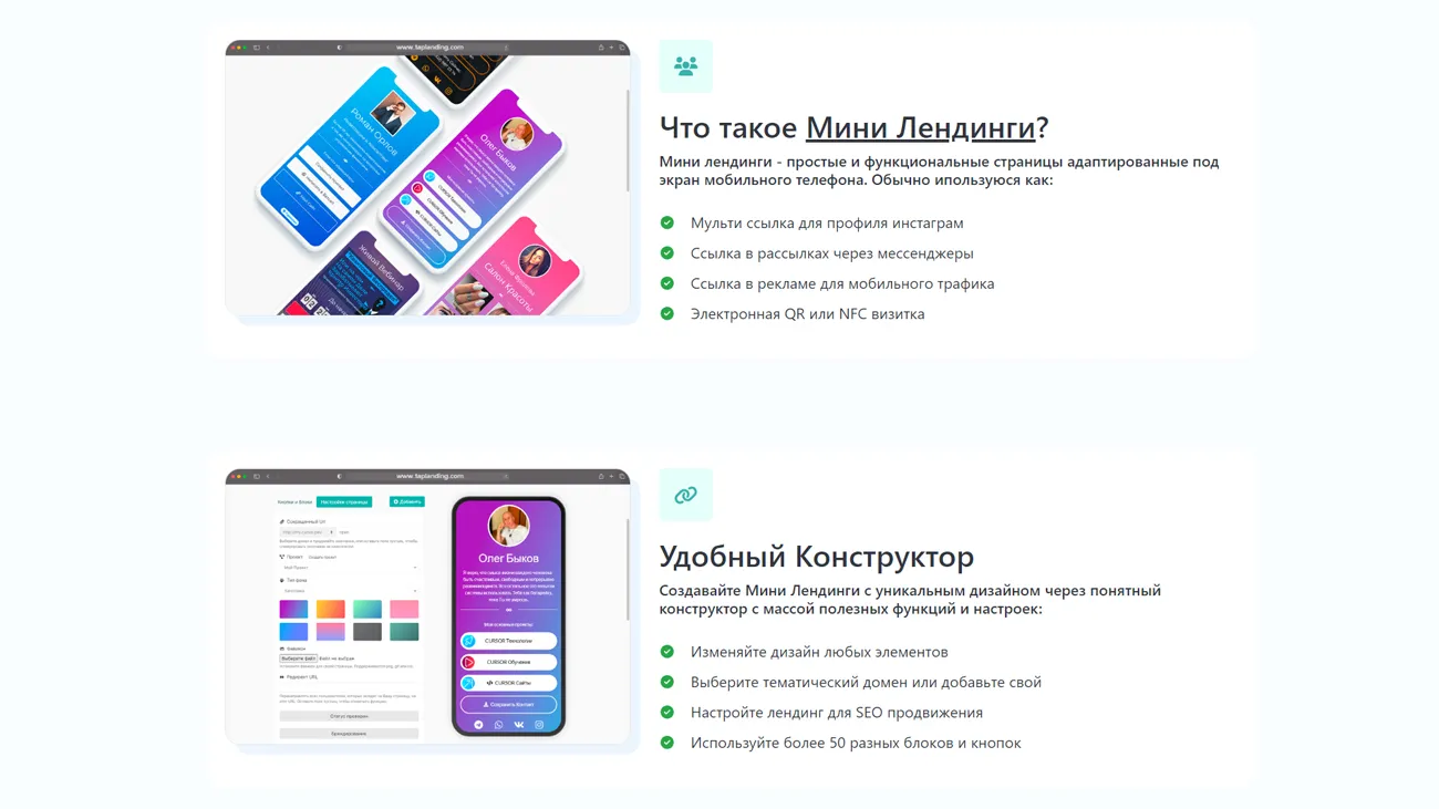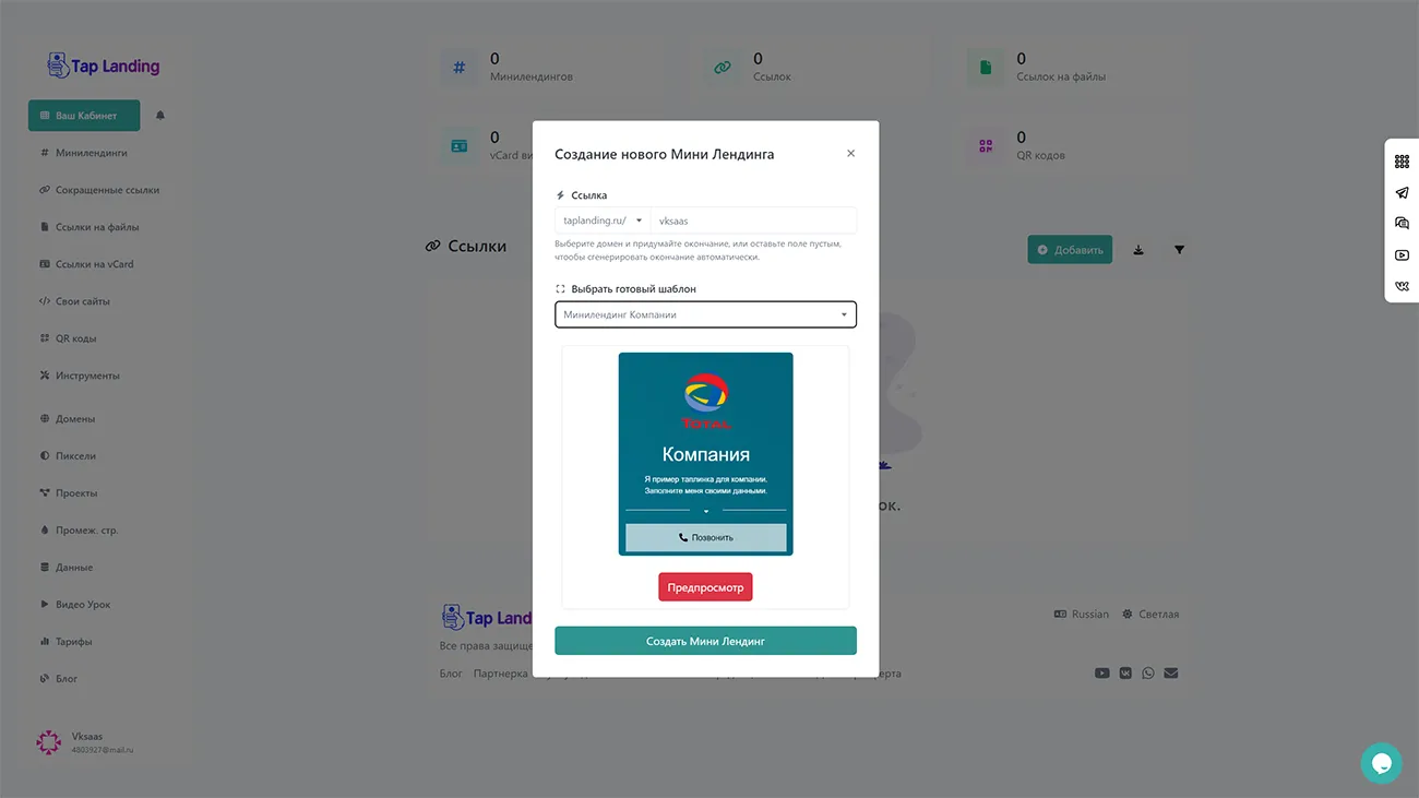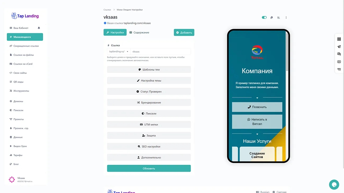 Tap Landing предлагает множество инструментов для создания мини-лендинга и элементов гипертекстового документа с возможностью группировки по разным направлениям в отдельные проекты. В них можно добавлять пиксели различных социальных сетей. Пользователям сервиса доступен следующий функционал: