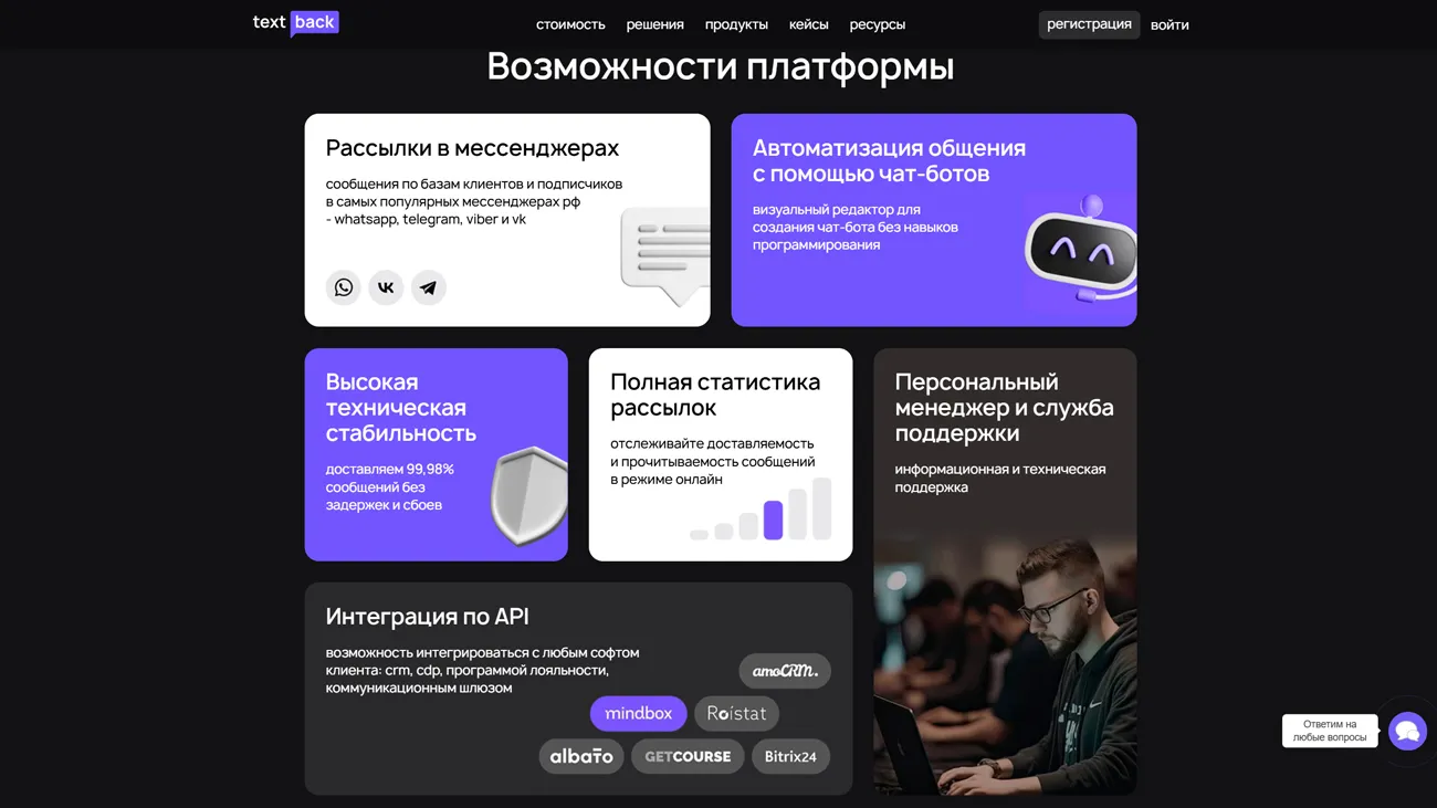 Готовые интеграции с популярными CRM и сервисами помогают быстро внедрить TextBack в бизнес-процессы без сложных настроек.
