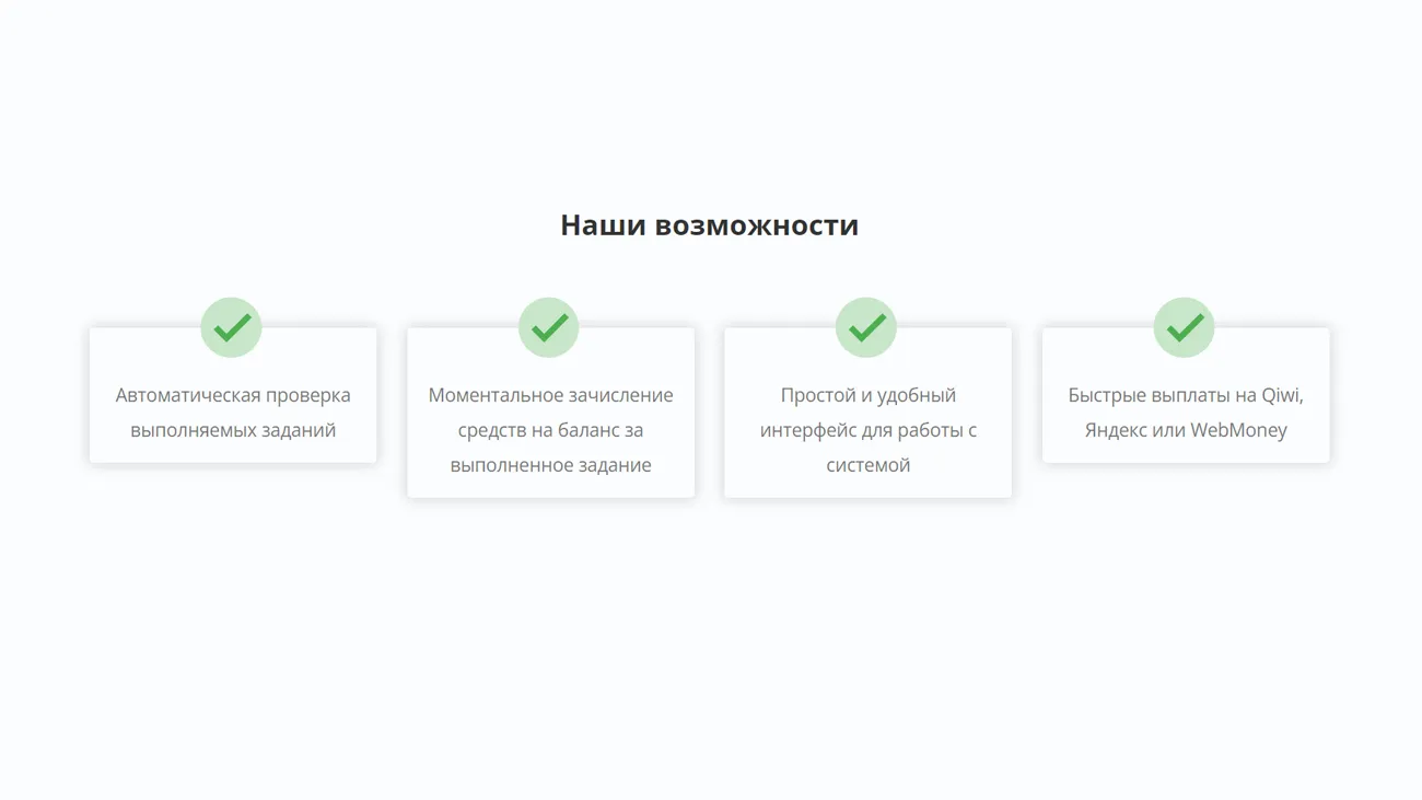 Быстрые выплаты: Заработанные средства могут быть выведены на платежные системы Qiwi, Яндекс.Деньги или WebMoney. Сервис обещает моментальное зачисление средств на баланс после выполнения задания.