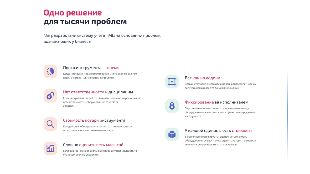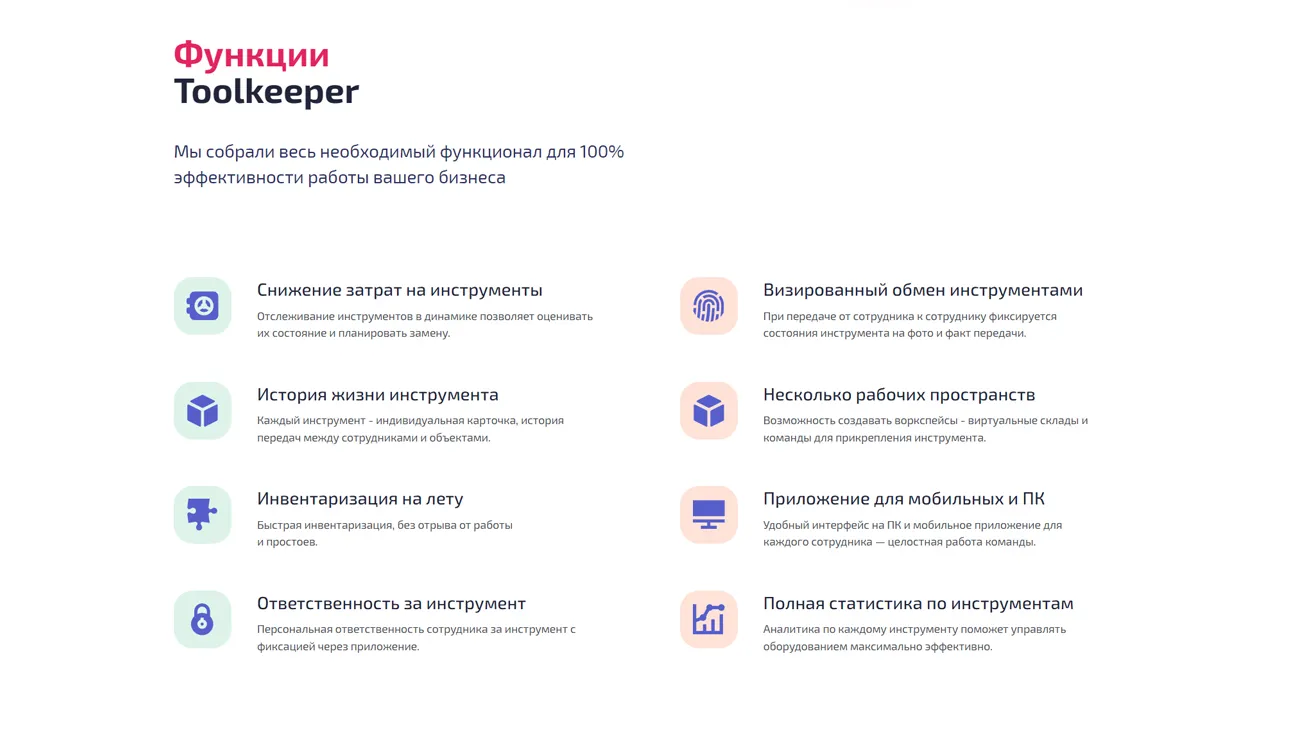 ToolKeeper предлагает широкий функционал для эффективной работы бизнеса с ТМЦ. Сервис предоставляет следующие возможности: