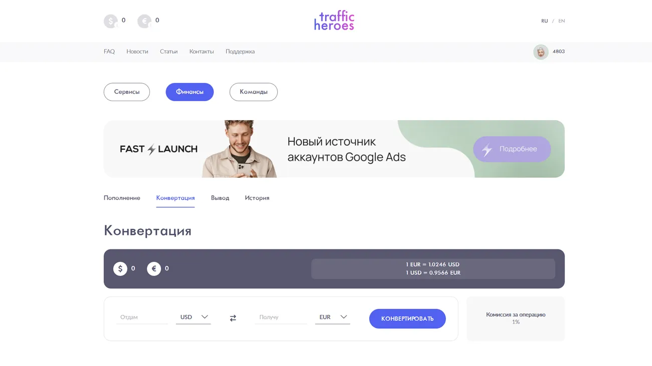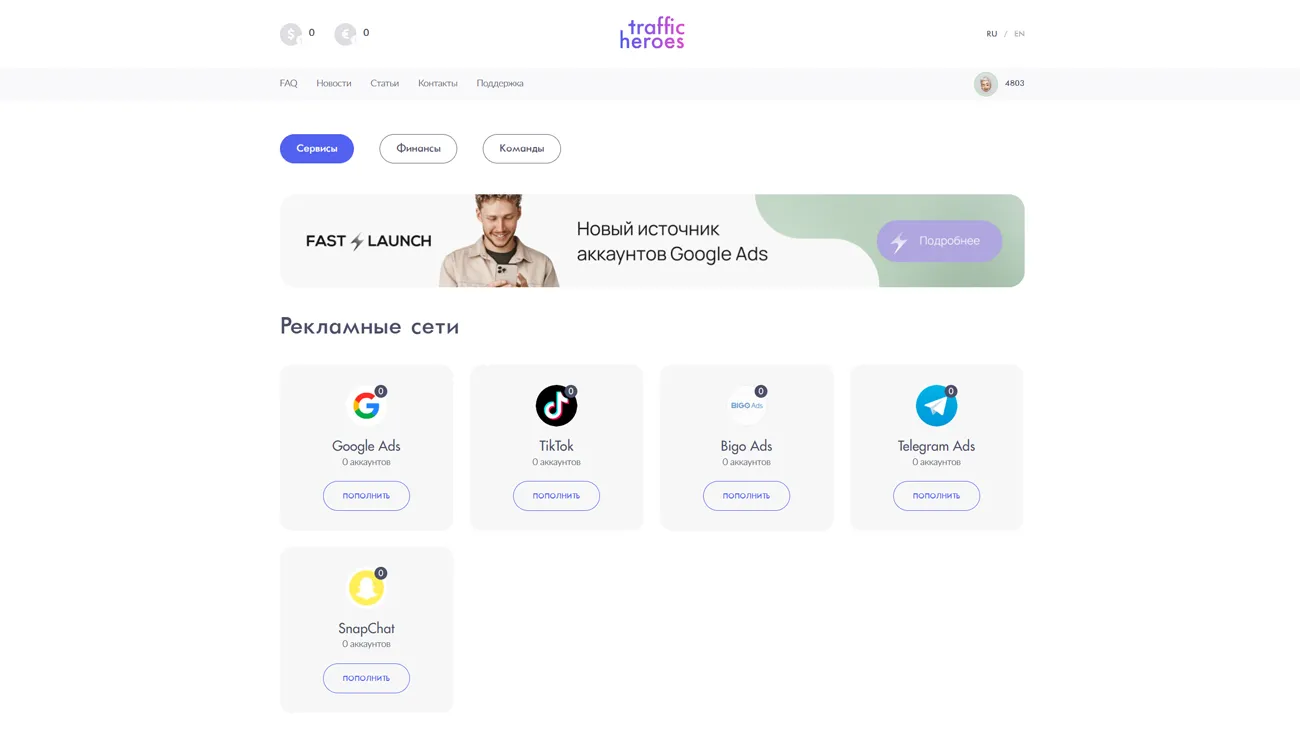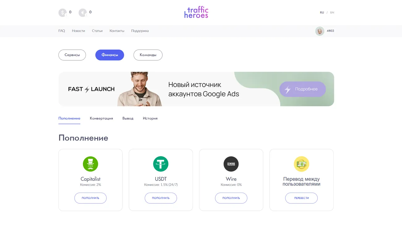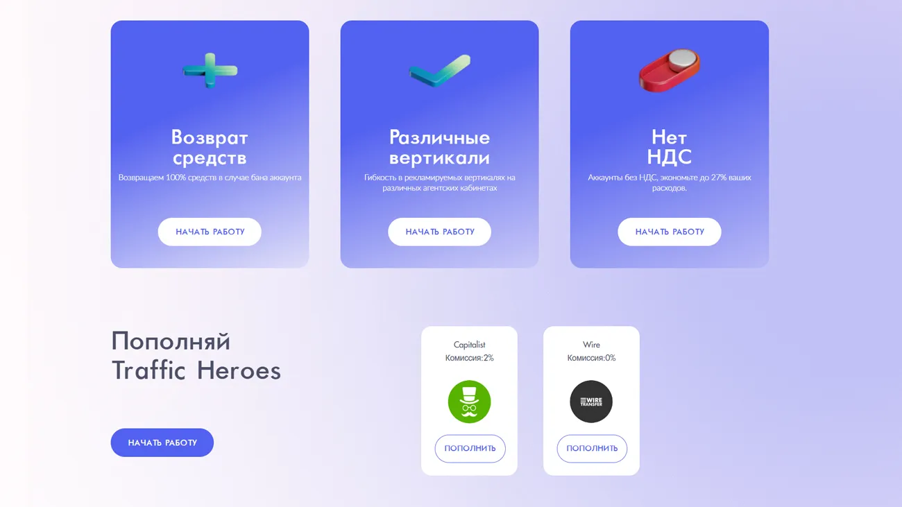 - Политика возврата средств: Traffic Heroes предлагает полный возврат баланса в случае блокировки аккаунта, если бан не связан с нарушением рекламной политики.