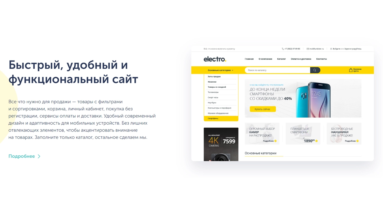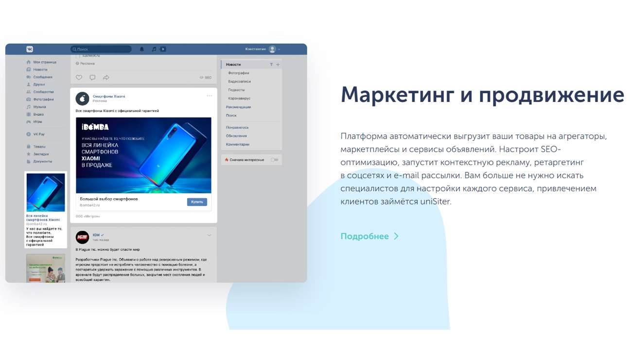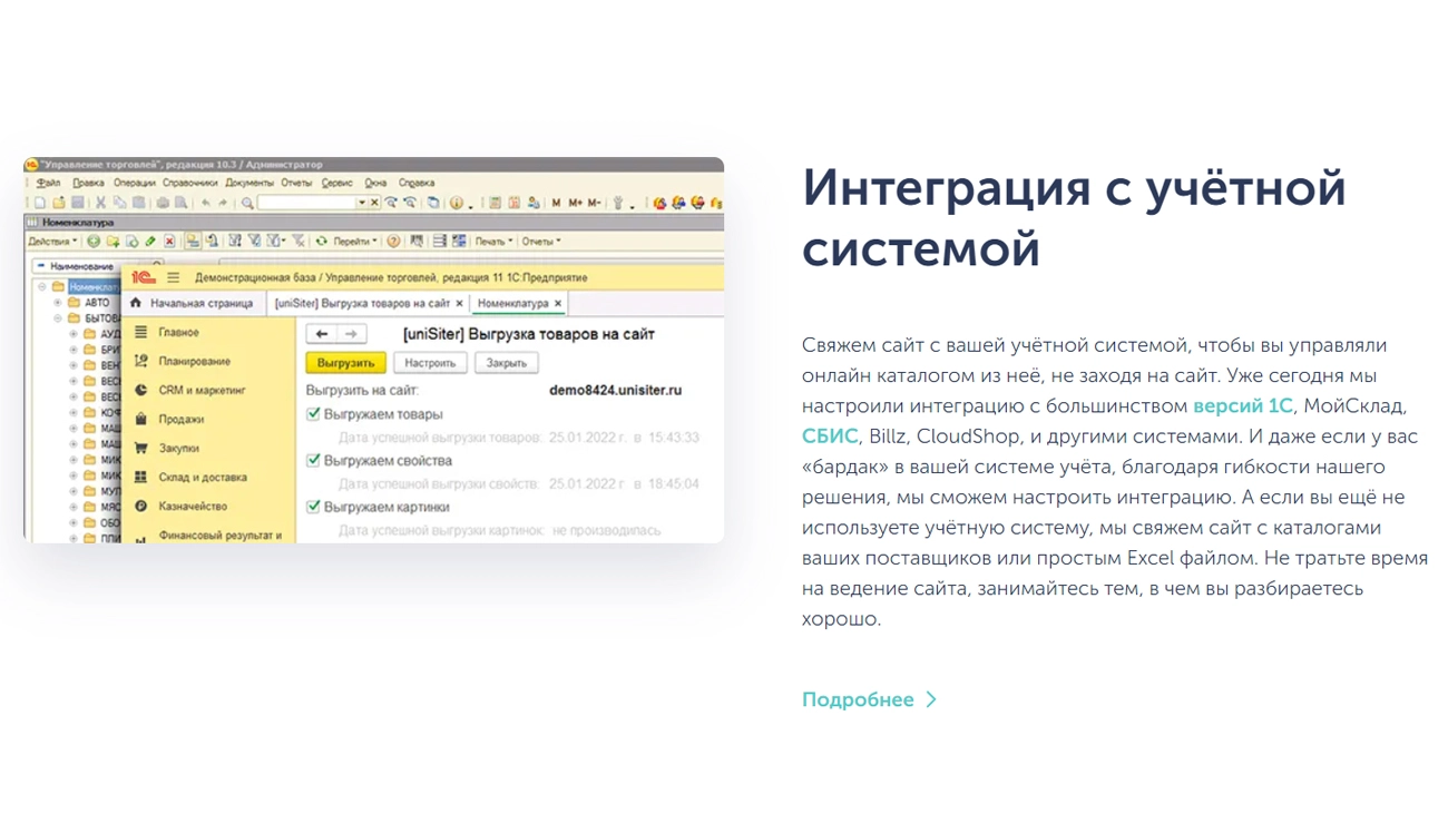 юниСайтер также предлагает удобный интерфейс для управления вашим сайтом и предоставляет дополнительные инструменты для создания сайта: обширную библиотеку шаблонов, которые можно легко настроить и применить к вашему сайту, сео-оптимизацию, интеграции с 1 С и другими товароучетными сервисами, интеграция с Roistat, несгораемые промокоды, скидки от объема заказа. Со всеми возможностями платформы uniSiter можно ознакомиться на официальном сайте разработчика.