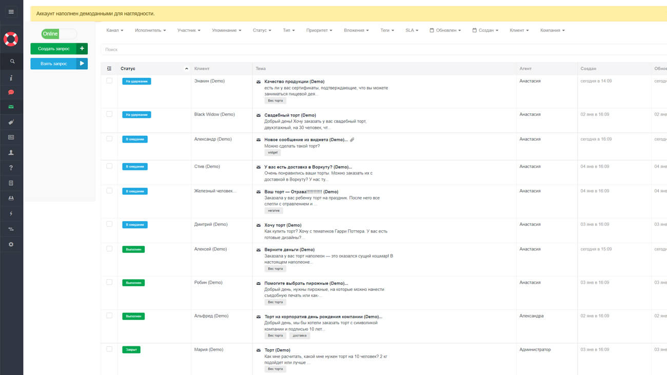 В кабинете доступно подключение до 20 каналов коммуникации – социальных сетей, почты, обращений с официальной страницы сайта и других мест. Для заявок и обращений система обеспечивает: