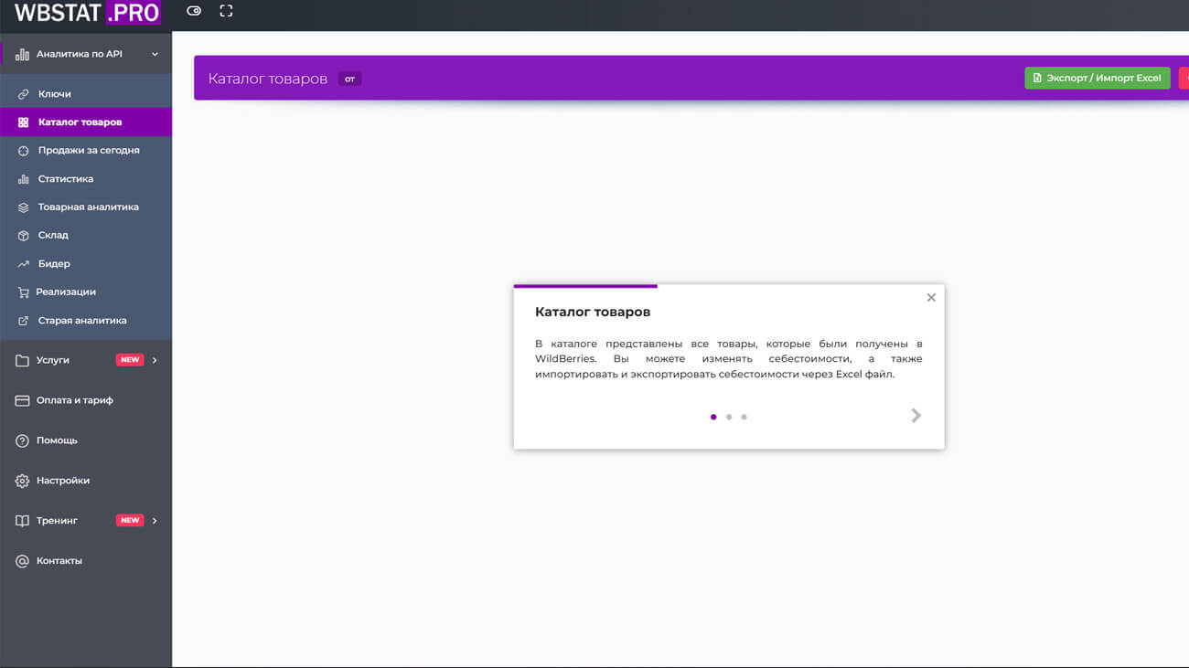 Представленный сервис WBStat быстро выполняет работу за несколько кликов, занимающую у пары аналитиков не менее двух недель. Программа обладает интуитивно понятным интерфейсом, с которым легко разберётся даже начинающий пользователь. Все позиции из выбранного маркетплейса находятся в каталоге. Тарификация оказываемых услуг зависит от количества товаров для необходимого ежемесячного анализа.