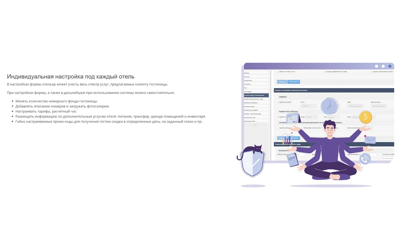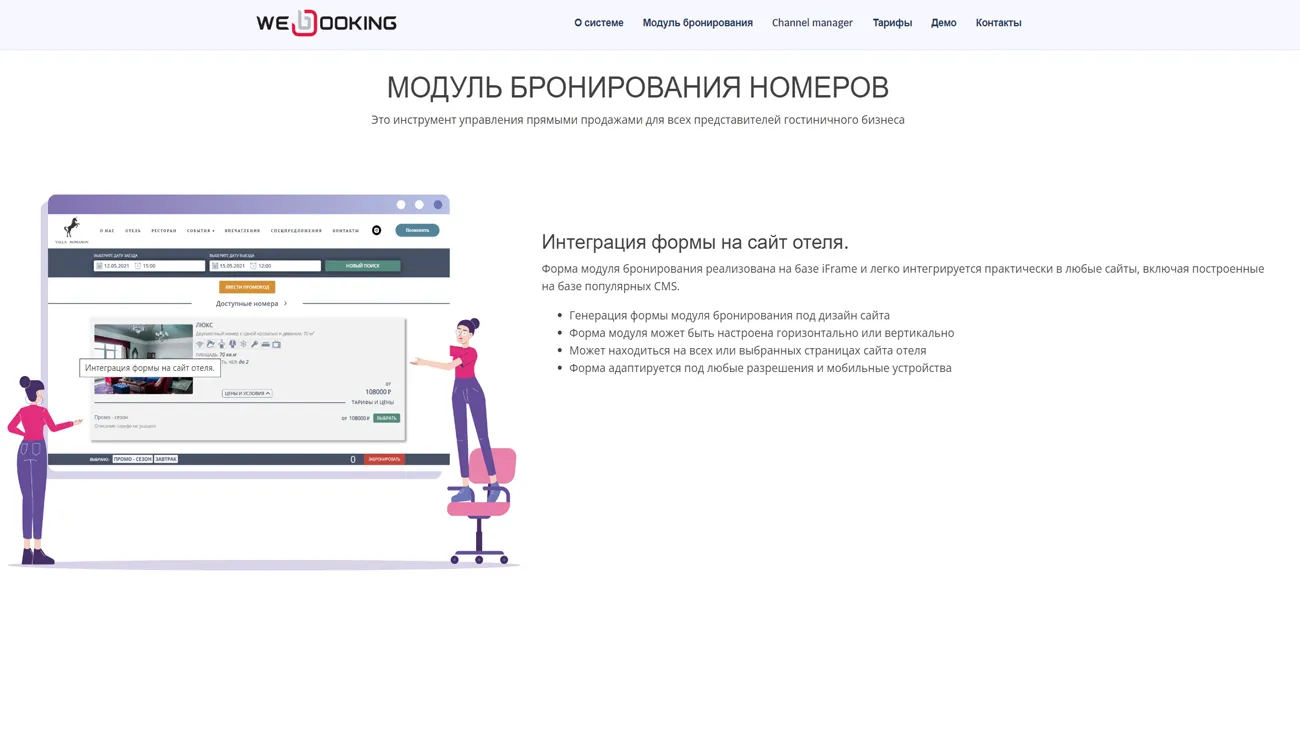 Модуль реализуется на базе iFrame, систематизируется со всеми сайтами, настраивается под параметры, которые необходимы для гостиницы.