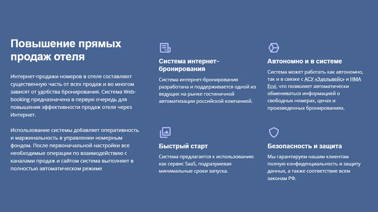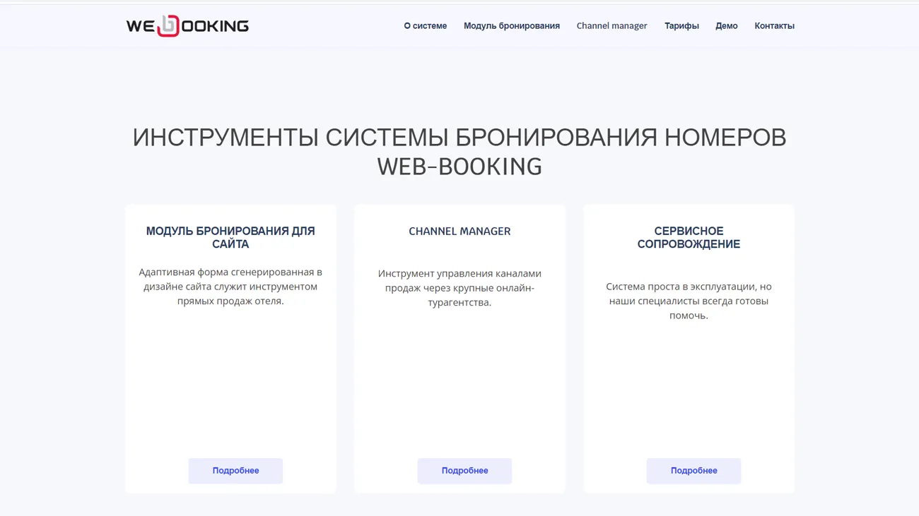 Программа предоставляет услуги по автоматическому интернет-бронированию номеров. Используя Web-Booking, предприниматели повышают эффективность продаж гостиницы в онлайн-сфере. Клиенты видят актуальную информацию о количестве свободных мест и оставляют бронь, которая автоматически подгружается в систему.