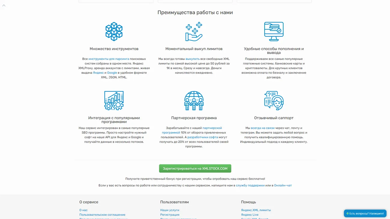 К преимуществам сервиса можно отнести: высокую скорость парсинга, большие суточные и часовые лимиты, удобство при использовании в программах SEO.